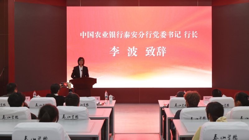 李波寄语在场学子,要珍惜韶华、笃志勤学,不负学校与社会的殷切期望,努力成长为可堪大用、能担重任的栋梁之材,未来以实际行动回馈社会、报效国家。同时,向同学们分享了中国农业银行泰安分行在助力人才培养方面的举措,表示未来将与泰山学院携手共同打造校企合作新典范。